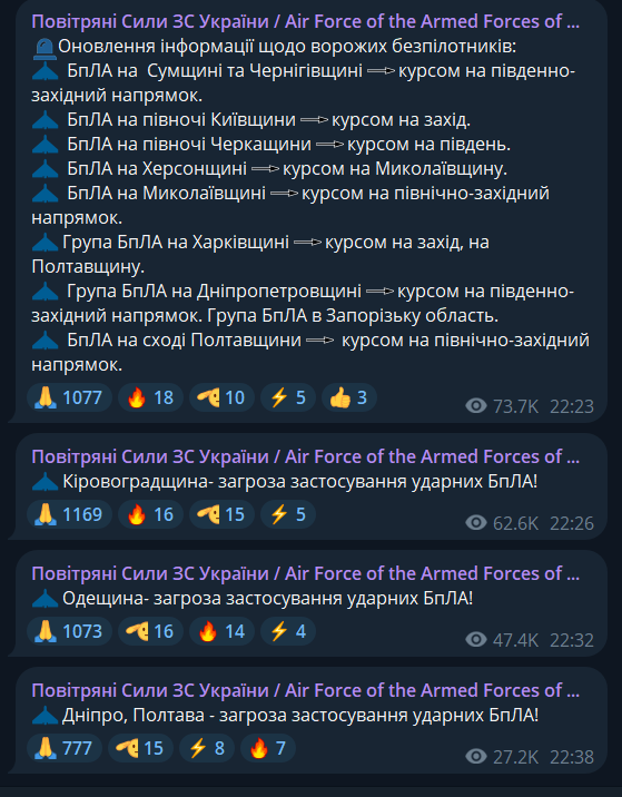 22:40 Зʼявилися перші ознаки, що буде зліт стратегічних бомбардувальників протягом ночі, – монітори. Загроза застосування "Шахедів" для Одещини, Кіровоградщини, Дніпра, Полтави. Вже лунали вибухи в Києві, працювала ППО. Крім того, гучно і в окупованих Маріуполі та Криму.