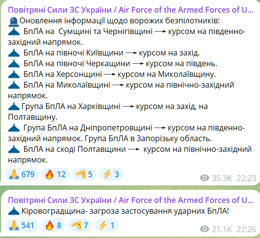 "Телеграф" уважно стежить за ситуацією. Вже до 115 дронів над Україною та постійно заходять нові.