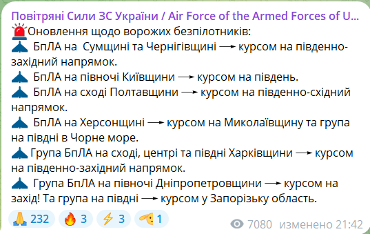 21:06 Монітори попереджають про дрони жителів населених пунктів на Житомирщині, Черкащині, Полтавщині, Дніпропетровщині, Донеччині, Харківщині, Сумщині та Чернігівщині.