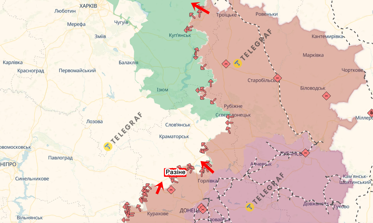 19:00 Росіяни окупували ще один населений пункт на Донеччині, повідомляє DeepState. Мова про Разіне на Покровському напрямку. Крім того, ворог просунувся біля Торецька і Диліївки на Торецькому напрямку, Відродження на Покровському напрямку та Красного Першого на Куп'янському напрямку.
