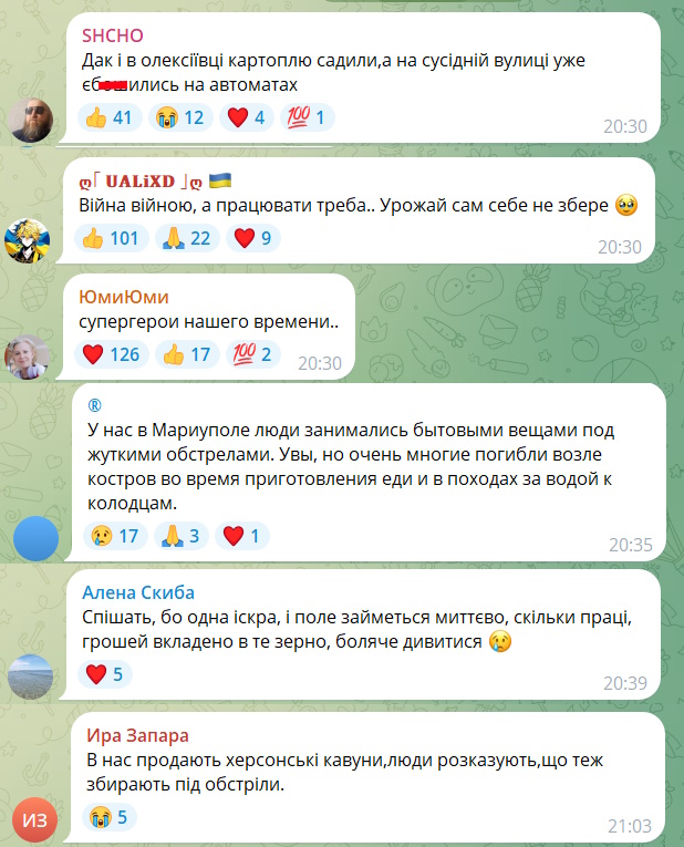 У мережі ж зазначили, що подібна картина, на жаль, дуже типова для прифронтових районів. Там люди дуже часто продовжують вести сільське господарство навіть попри загрозу постійних обстрілів. Дехто наголосив, що для багатьох мирних жителів це вже закінчилося втратою життя.