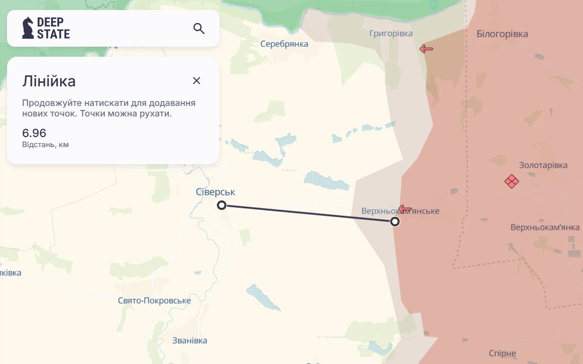 Варто зазначити, що Сіверськ це невелике місто неподалік Лисичанська. За даними DeepState, до нього до лінії фронту приблизно 7 кілометрів.