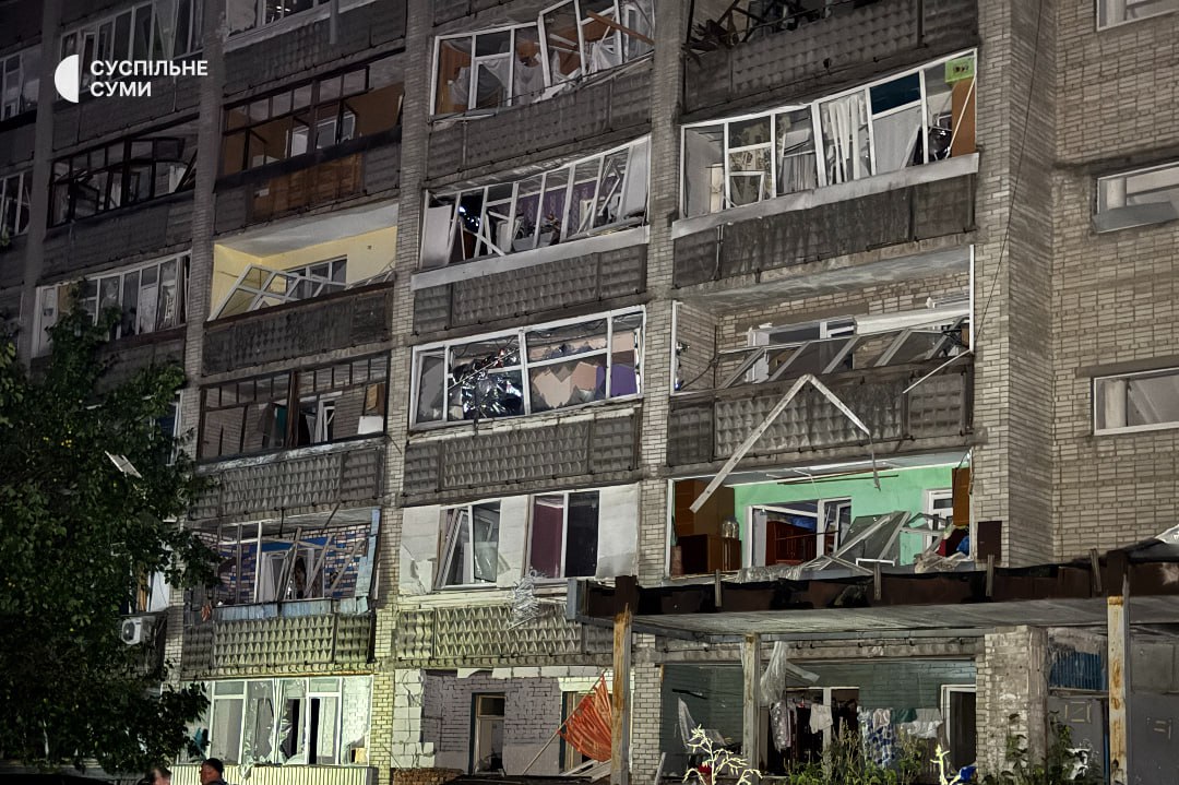1:00 Росіяни завдали удару по Сумах, через що постраждали 5 багатоповерхівок та 18 автомобілів. Відомо про трьох поранених, серед них дитина