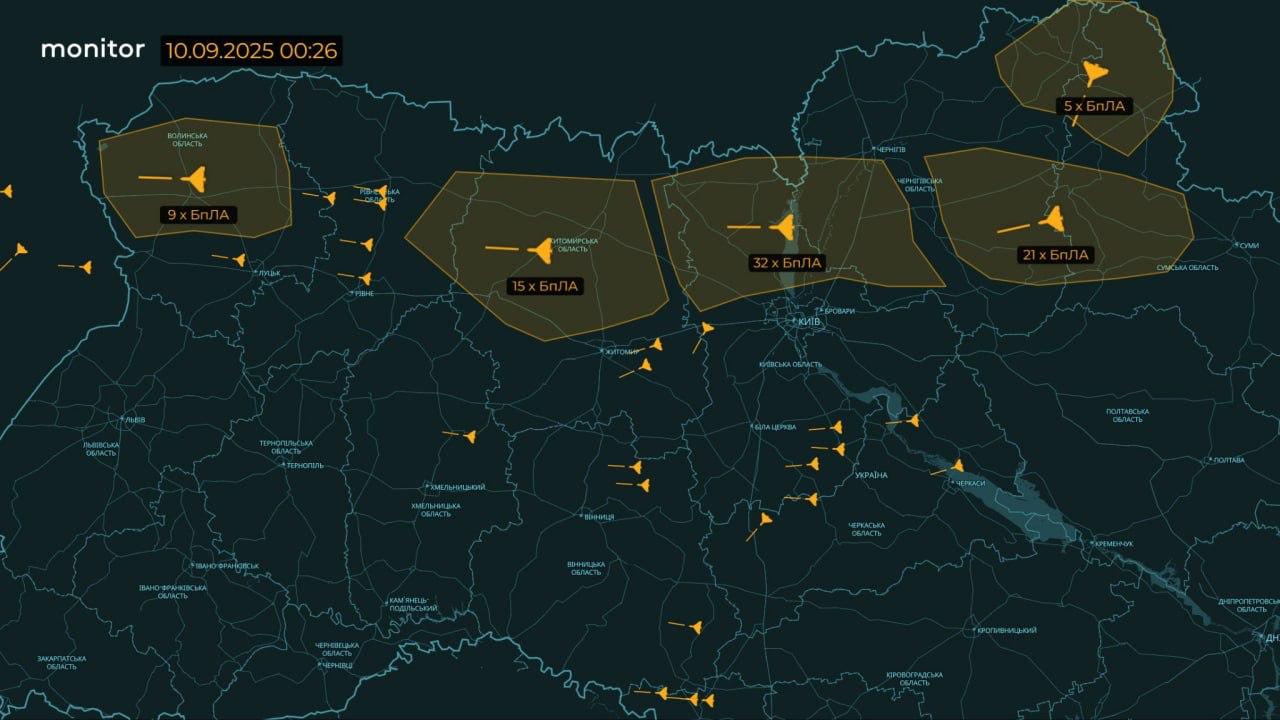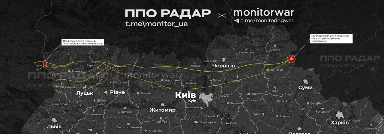 Щодо дронів над Україною, то основна їхня маса йде через північні та Київську область у бік Волинської та Львівської. Також кілька штук фіксували над Одеською та Черкаською.