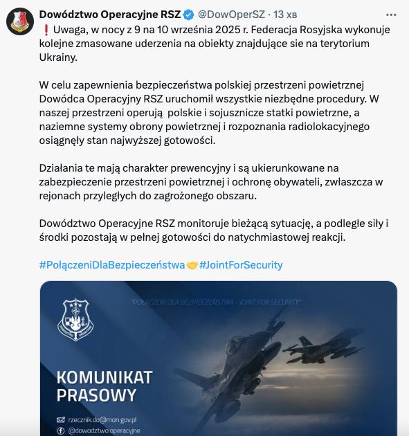 02:30 Підтверджено, що під час атаки на Україну російські окупанти вперше атакували дронами Польщу. Деяка кількість ударних безпілотників пішла курсом на Жешув, Варшаву, Люблін та Перемишль. У відповідь польське командування підняло винищувальну авіацію, яка почала збивати (!) російські дрони. Загалом у повітряний простір Польщі залетіло 10-20 безпілотників.