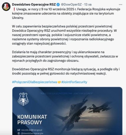Триває операція, пов’язана з численними порушеннями польського повітряного простору. Проти об'єктів військові застосували зброю. Я перебуваю в постійному контакті з президентом і міністром оборони. Отримав прямий звіт від оперативного командира
