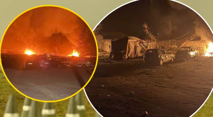У Запорізькій ОВА показали наслідки атаки. На місці атаки палають будівлі і автівки.