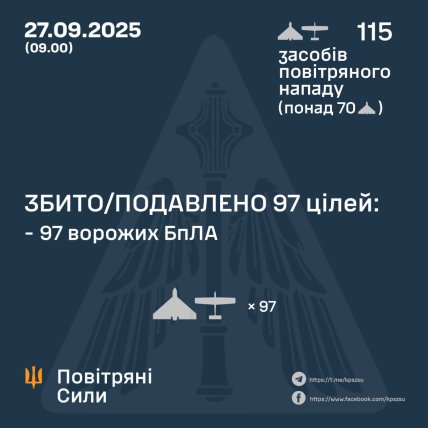 09:15 В ніч на 27 вересня Росія атакувала Україну 115 безпілотниками, 97 з яких знешкодили сили ППО. Зафіксовано влучання 17 ударних БпЛА на 6 локаціях, а також падіння збитих (уламки) на 2 локаціях. Атака триває – на півночі нові групи ударних БпЛА.
