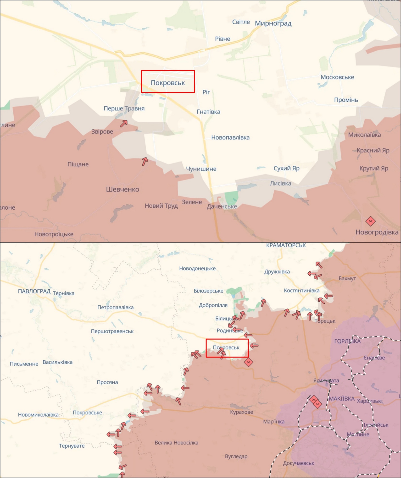 Противник намагається просуватися на захід від Покровська та має очевидний намір вийти на північно-західні околиці міста. Також його дії вказують на намір посилити наступ і на південь та південний-схід від Покровська, щоб закріпитися у невеликих населених пунктах агломерації.