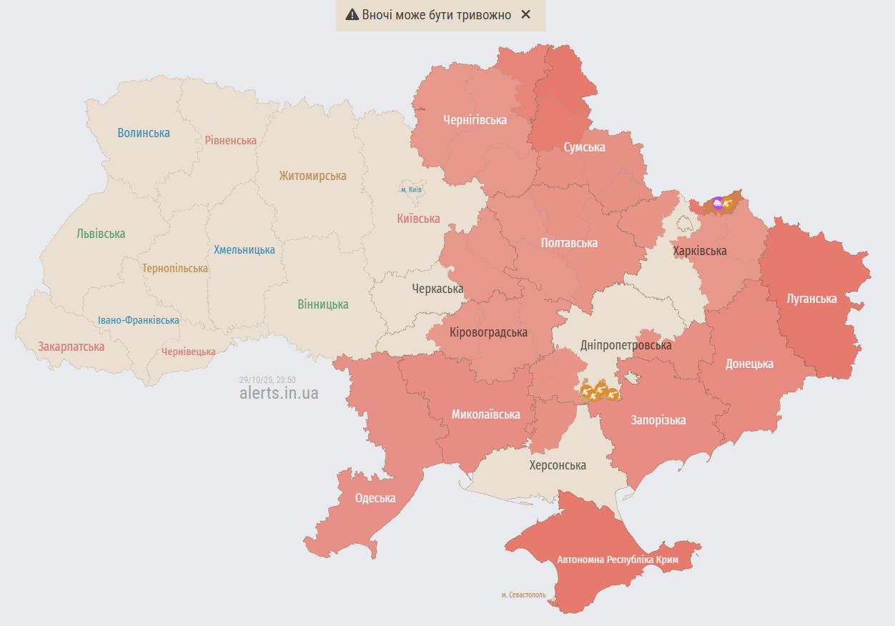 01:00 Близько 40 ворожих дронів у повітряному просторі України. Повітряну тривогу оголошували в Києві. Стратегічна авіація поки що неактивна, як і залишки російського флоту — попри попередження про можливу ракетну атаку вночі.