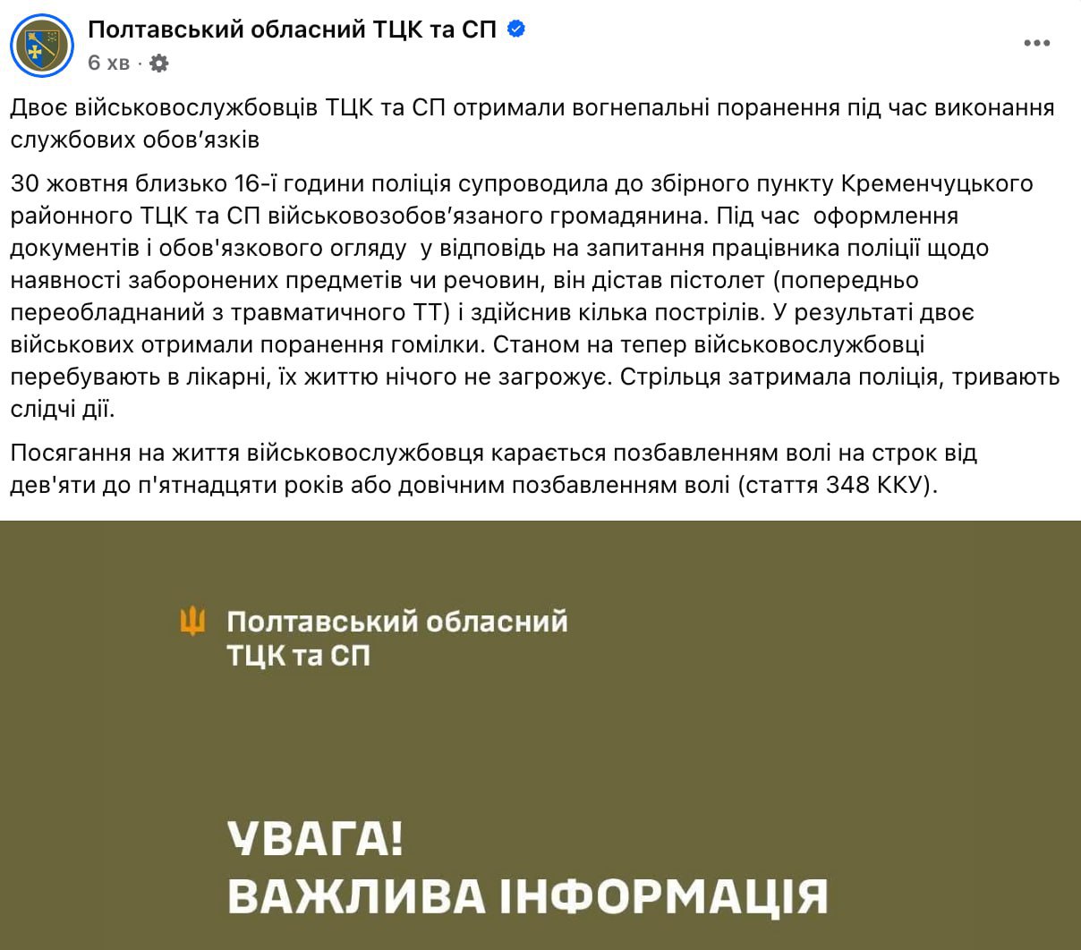 18:30 Стрілянина в ТЦК у Кременчуці: двоє військовослужбовців ТЦК поранені.