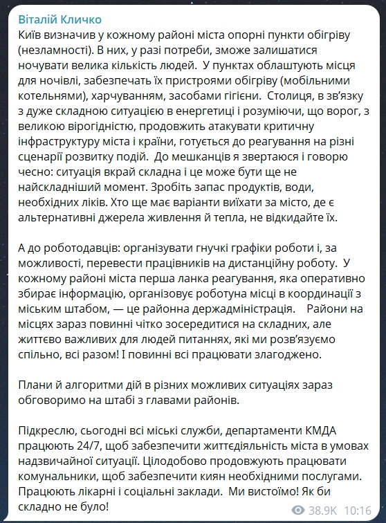Мер Києва Віталій Кличко запевнив, що влада робить все необхідне, аби забезпечувати життєдіяльність столиці, однак вкотре закликав тих киян, які мають подібне можливість, тимчасово покинути місто.
