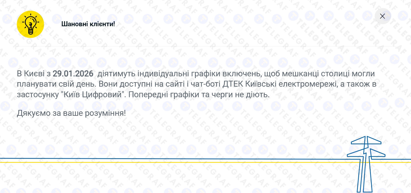 11:15 У Києві із 29 січня запроваджують тимчасові графіки відключення світла. Як зазначили у ДТЕК, наявність світла буде варіюватися не по групах, а по окремих будинках. Рівномірного розподілу електроенергії, на жаль, чекати не варто, адже в різних районах пошкодження системи відрізняються. Про свої графіки можна дізнатися на сайті чи чат-боті "ДТЕК: Київські електромережі" або у застосунку "Київ Цифровий", увівши потрібну адресу.