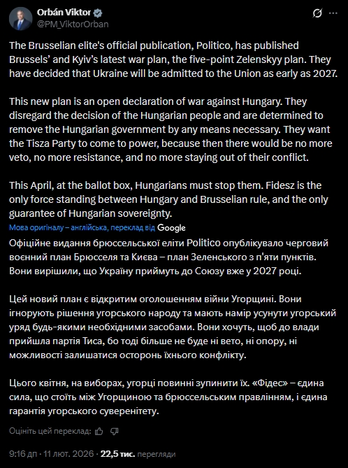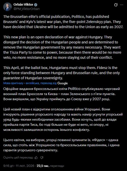 Прем'єр Угорщини Віктор Орбан заявив, що Брюссель та Київ "відкрито оголосили війну Угорщині". Таким чином він прокоментував публікацію видання Politico про можливий скорочений вступ України до ЄС уже у 2027 році