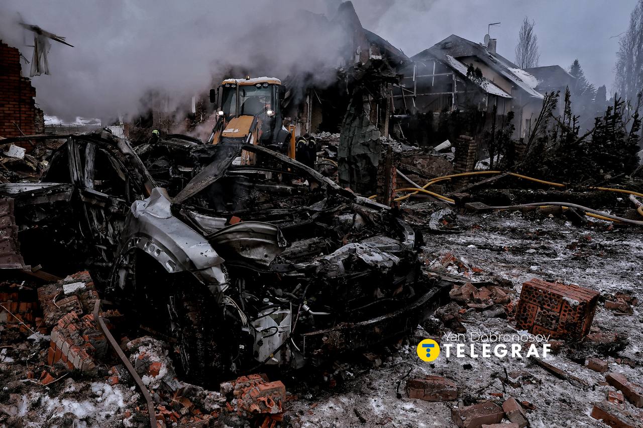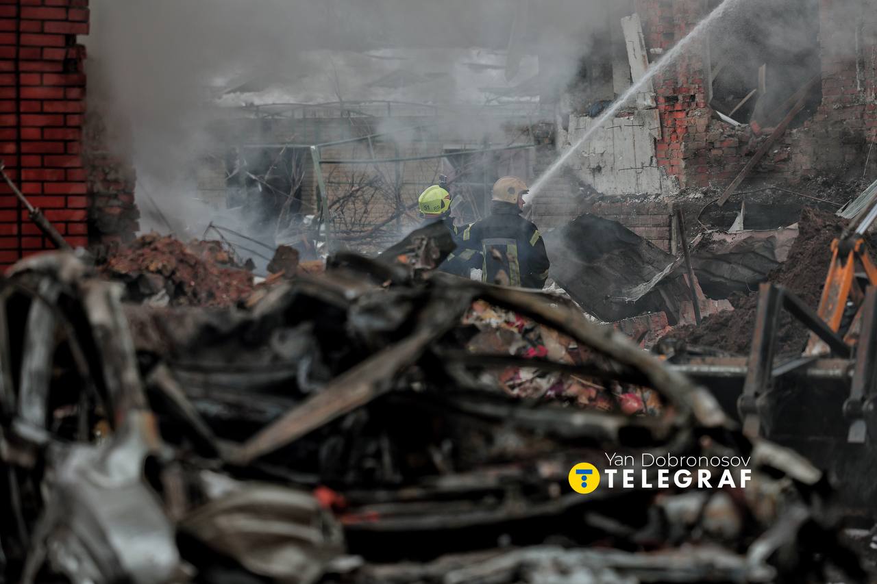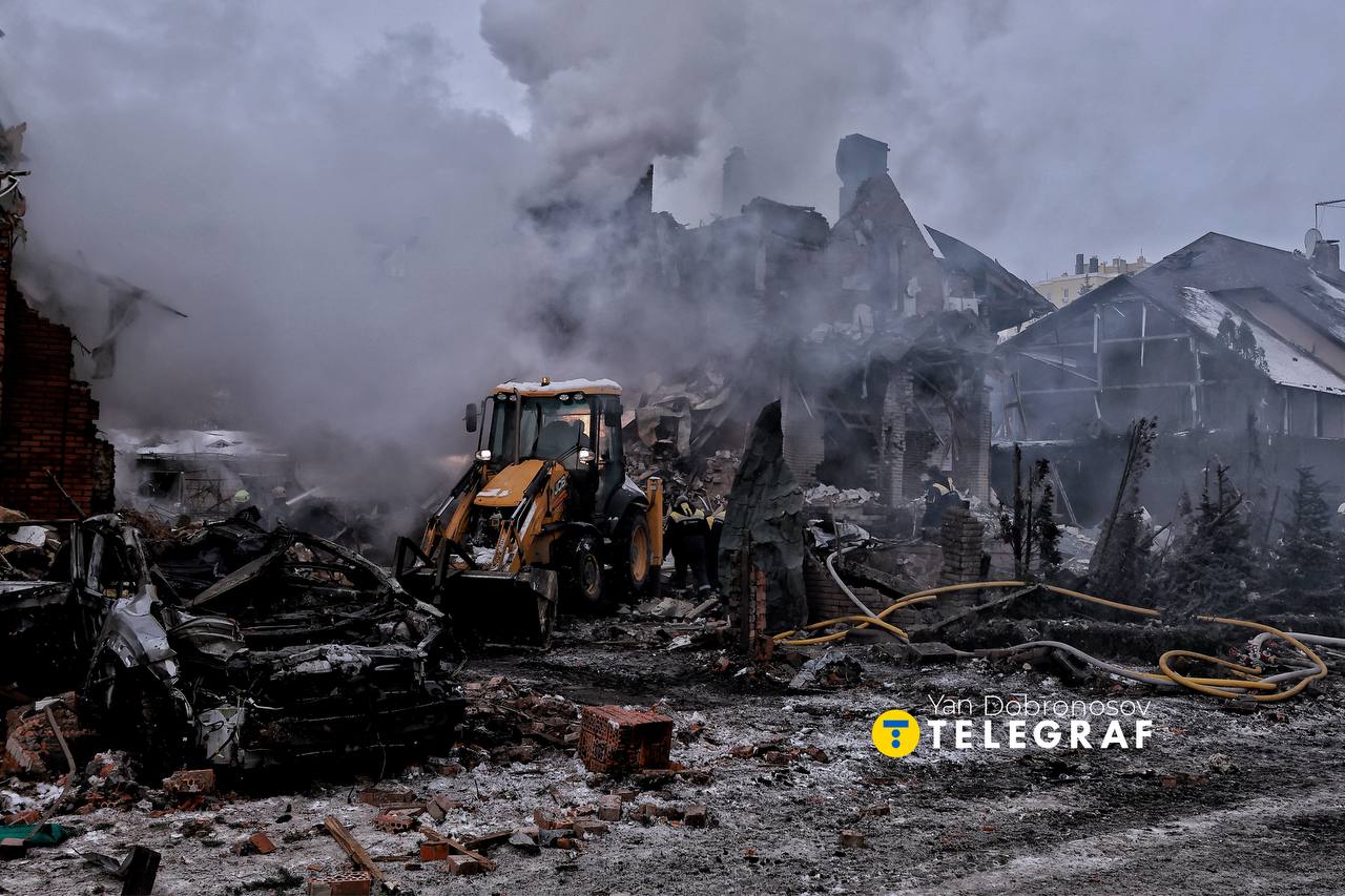 На місці події побував кореспондент "Телеграфа" Ян Доброносов та показав, що там зараз відбувається. На кадрах видно масштаб руйнувань: будинки частково зруйновані, полум’я та дим продовжують підніматися.