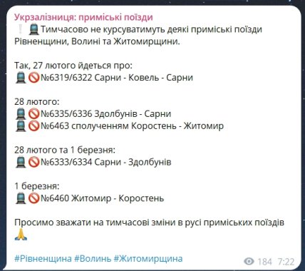 Укрзалізниця скасувала низку приміських потягів у трьох областях України. За даними пресслужби компанії, відсутність окремих рейсів — тимчасова. Обмеження торкнулися Рівненської, Волинської та Житомирської областей.