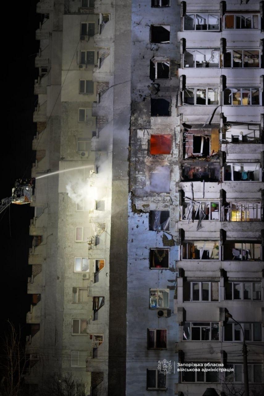 Росія завдала по Запоріжжю масований комбінований удар безпілотниками та ракетами, повідомив глава Запорізької ОВА Іван Федоров. Пошкоджено шість багатоквартирних та два приватних будинки, магазин, нежитлові будівлі, об'єкт промислової інфраструктури. Пошкодження отримала будівля торгівельного центру у середмісті.