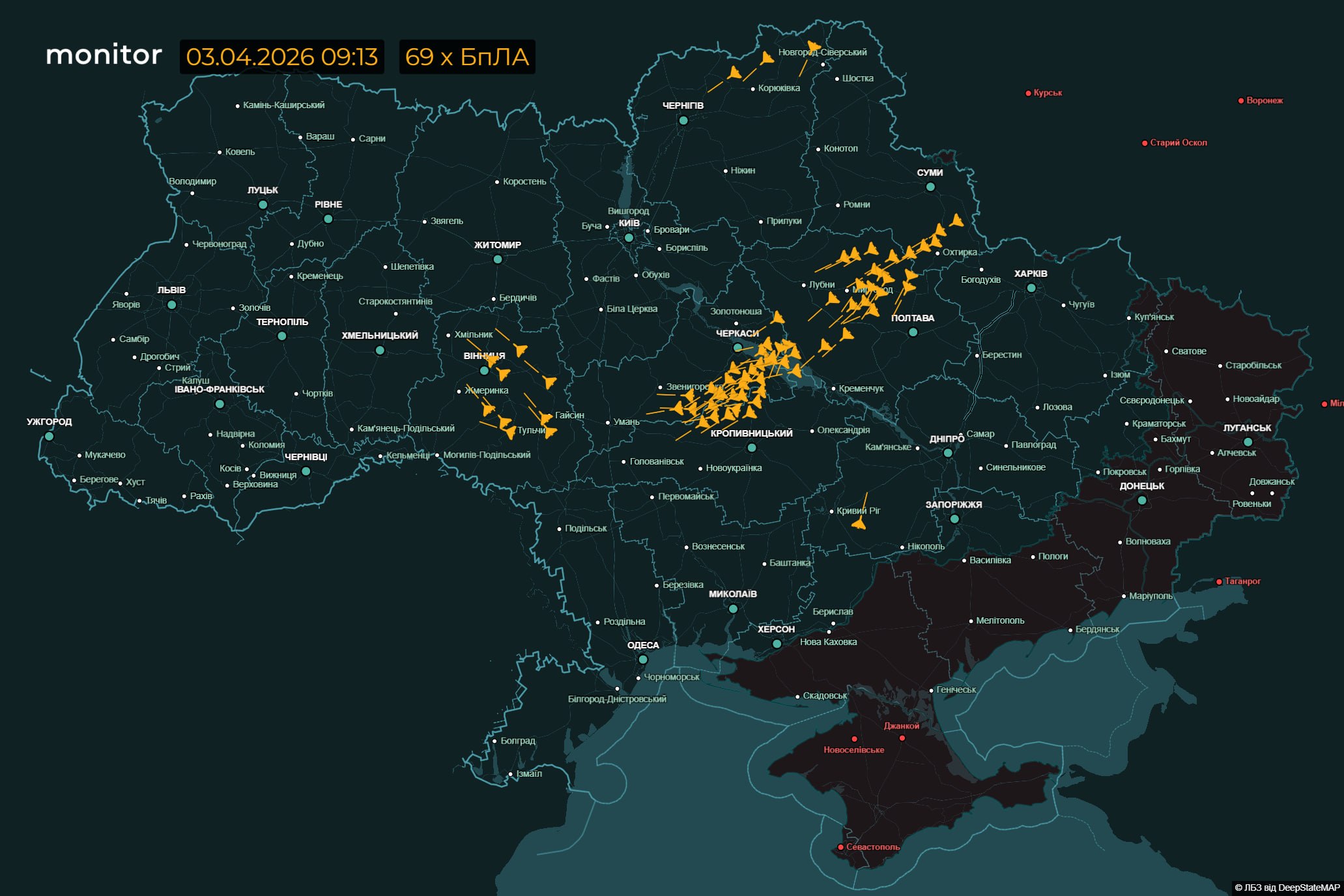 Станом на 9:00 над Черкащиною моніторингові канали помітили табун безпілотників — 60 дронів. На Вінниччині вже пролунали вибухи — область під повітряною атакою ворога, там досі фіксують дрони в повітряному просторі. Також відомо про зліт бортів Ту-22М3 та виконання ними пускових маневрів. Про пускові маневри від бортів Ту-95 та Ту-160 також повідомлялось.