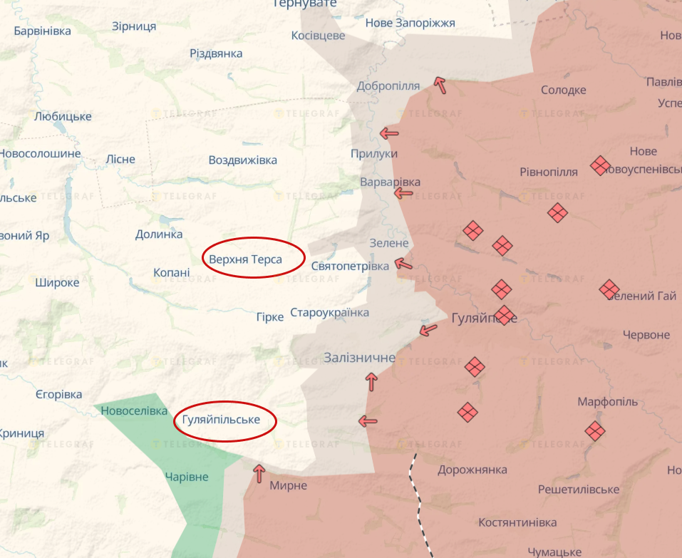 Експерт оцінює, що на Запорізькому напрямку навпаки, відбувається посилення бойових дій. Одночасно з тим, росіяни намагаються наступати на захід і північний захід від Гуляйполя — по лінії Верхня Терса – Гуляйпільське. Збройні сили України, своєю чергою, контратакують Залізничне Гуляйпільське, Зелене, Прилуки.