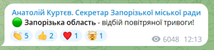 Секретар Запорізької міськради Анатолій Куртєв закликав усіх мешканців Запоріжжя терміново пройти в укриття. Окремі моніторингові пабліки повідомляють, що у повітрі над областю зафіксовано ще кілька ворожих цілей, які можуть прямувати до міста.