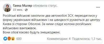 Об этом сообщила замминистра обороны Анна Маляр. Машины видели в Гостомеле, в Киев они заезжали со стороны Оболони.