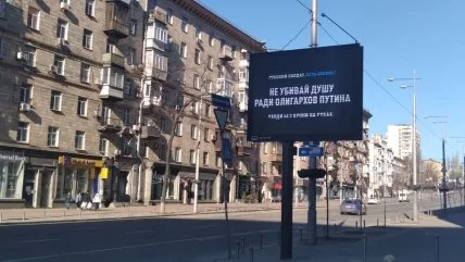 В городах, которые подверглись нападению российских оккупационных войск, жители разместили на билбордах послание для солдат из страны-агрессора.