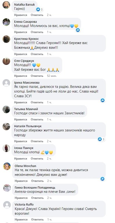 "Смотрю и радуюсь!", "Молодцы парни", "Как красиво горит", "Слава ВСУ!", "Можно смотреть вечно", "Пусть вас бог бережет", — среди прочего, пишут в комментариях.