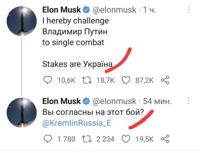 "Я вызываю владимира путина на личный поединок. Ставкой является Украина", — написал Маск. И ниже на русском языке дописал "Вы согласны на этот бой?", тегнув в публикации аккаунт Кремля.