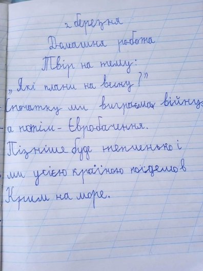 "Сначала мы выиграем войну. Потом – Евровидение. Позже будет тепло и мы всей страной поедем в Крым на море", — написал мальчик.