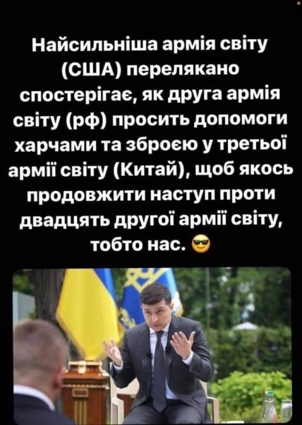 "Самая сильная армия мира (США) перепугано наблюдает, как вторая армия мира (рф) просит помощи продуктами и оружием у третьей армии мира (Китай), чтобы как-то продолжить наступление против 22-й армии мира, то есть нас. Это прекрасно", — пишут в сети.