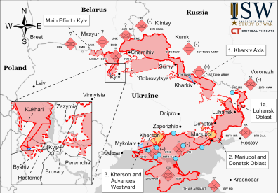 Специалисты Institute for the Study of War утверждают, что за сутки 22 марта российские оккупанты продолжали бомбить города, но не шли в наступление, — вместо этого украинцы сами успешно контратаковали их на киевском направлении и под Николаевом.