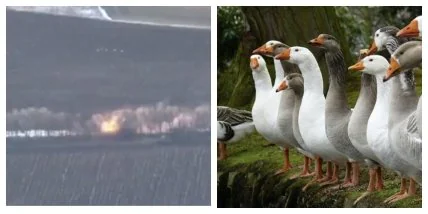 На видео видно, как гуси пролетают над техникой захватчиков прямо в тот момент, когда бойцы ВСУ бомбят врагов. Кажется, что именно гуси скидывают бомбу на войска рф.