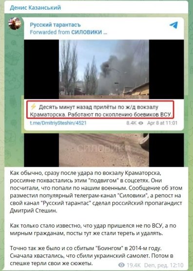 Украинский журналист Денис Казанский опубликовал у себя в телеграме скрин поста из телеграм-канала "Русский тарантас", который ведет российский пропагандист Дмитрий Стешин, что россияне "нанесли удар по ж/д вокзалу, ведь работали по скоплению боевиков ВСУ".