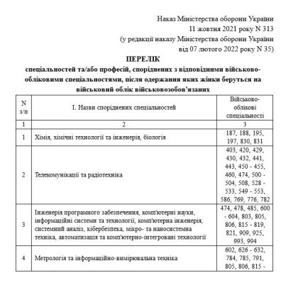 Как сообщает портал "ligazakon", в обновленном официальном документе перечислены профессии после получения которых прекрасная половина жителей украинского государства вносится в списки военного учета, а также перечень специальностей, схожих с военно-учетными.