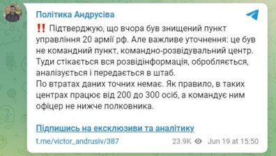 Как уточнил в своем телеграм-канале советник главы МВД и главы Офиса президента Виктор Андрусив, речь идет не просто о командном пункте, но о командно-разведывательном центре.