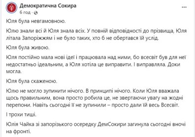 "Юлия Чайка из запорожской ячейки "ДемСокири" погибла сегодня ночью на фронте", – отметили в организации.