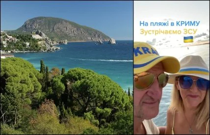 На нем семейная пара стоит на побережье в патриотичных головных уборах и говорит на украинском: "На пляже в Крыму встречаем закат солнца и ВСУ. До встречи! Крым наш, Украина наша, мы победим!".