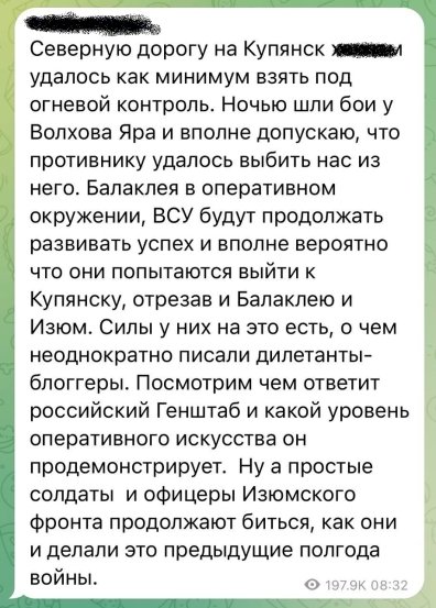 Так, прокремлевские телеграм-каналы начали писать о том, что ВСУ взяли под огневой контроль дорогу на Купянск. Кроме того, оккупантов вероятно уже выбили из Волохова Яра – по некоторым данным два отряда росгвардии (СОБРа) там взяты в полное окружение. Кроме того, украинские силы обороны, по жалобам россиян, сейчас пытаются запереть Изюм и Балаклею в котел.