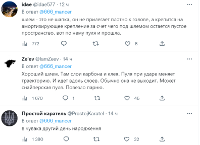 Также пользователи добавили, что большую роль могло сыграть то, что каска не была закреплена. Таким образом она съехала от кинетической энергии пули, и та проскользнула над головой.