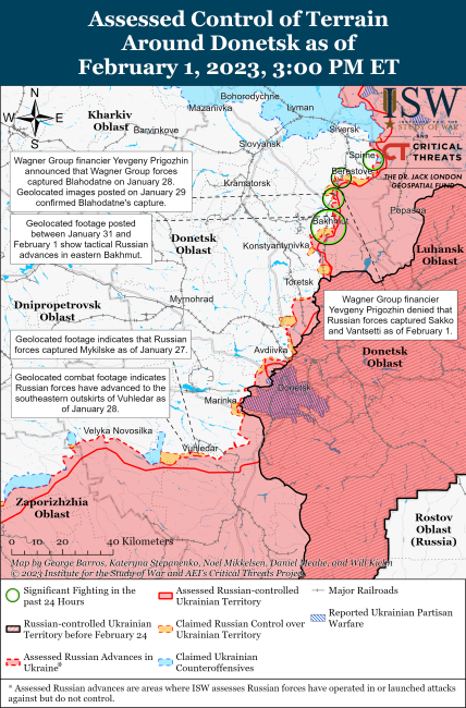 Российские войска продолжали наземные атаки к северо-востоку и юго-западу от Бахмута. Враг мог немного продвинуться к северо-востоку от Бахмута в районе Красной Горы и на северо-восточной и восточной окраинах Бахмута, к югу от Бахмута в районе Опытного и с юга от Бахмута. Враг привлек более компетентные силы и использует новые техники атак на этом направлении. В окрестностях Донецка нет подтверждения о нанесенных ударах. В районе Угледара россияне заявляют об украинской контратаке.