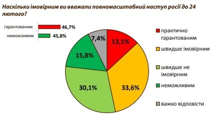 Что полномасштабное наступление российских войск на Украину 24 февраля 2022 года гарантированно состоится, а президент рф владимир путин объявит нам войну, считали 46,7 процента наших граждан, в то время как противоположного мнения придерживались 45,8%.