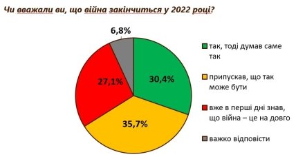 В то же время считали, что война закончится в 2022 году 30,4% украинцев. Еще 35,7% предполагали, что так может быть. Уже с первых дней знали, что война надолго — 27,1%. Затруднились ответить на вопросы анкеты — 6,8% граждан.