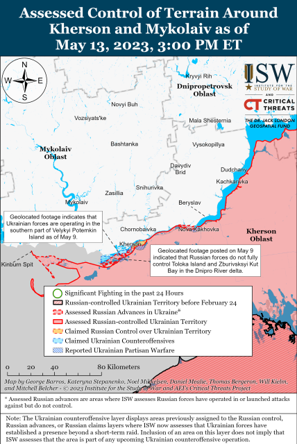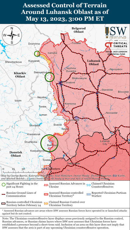 Как говорится в отчете Института изучения войны, по состоянию на 13 мая известно об уволенных 16,85 кв. километры в районе Бахмута. Отмечается, что враг продолжает атаковать неподалеку от Купянска, к северо-западу от Сватового и на разных направлениях в Донецкой области.