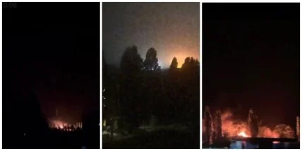 На опубликованных кадрах с места события можно заметить, что к рассвету возгорание на нефтебазе еще не было ликвидировано.