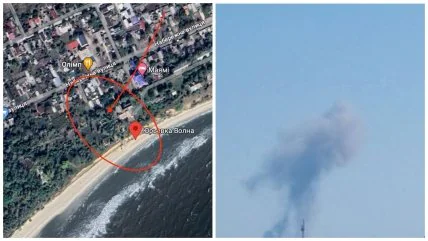 Также Андрющенко показал фотографии с места прилета. На них видно, что там поднимается дым. Сам лагерь расположен на побережье Азовского моря.