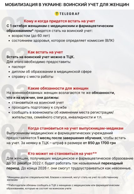 "Телеграф" рассказывает о том, кто будет подлежать обязательному воинскому учету. Таким женщинам, в частности, нужно будет пройти медкомиссию, отчитываться о месте регистрации и так далее.