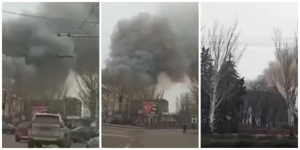 В центре временно оккупированного Донецка разгорелся крупный пожар. Над городом поднимаются черные столбы дыма.