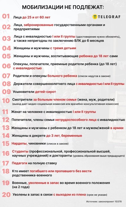 В Украине предлагается существенно изменить правила мобилизации. В случае принятия Радой нового законопроекта 10378 против уклонистов введут санкции (даже против тех, кто сейчас за границей), повестки теперь смогут отправлять онлайн, а список категорий для отсрочки от службы сокращается. Появляется демобилизация для тех, кто в армии долго и тех, кого освободили из плена. "Телеграф" объясняет, что нового будет: