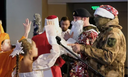 В Доме культуры Железнодорожников во временно оккупированном Мелитополе на утренник в честь Нового года пришли росгвардейцы с оружием и вручили детям подарки. Они надели поверх формы костюмы Деда Мороза, но все же просматривались разгрузки и автоматы.