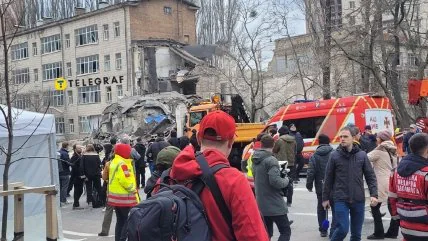 Полиция отгоняет гражданских и профессиональных репортажников и стримеров. Вокруг скопилась толпа. То, что россияне могут нанести повторный удар, как они это делали не раз, кажется, никого не беспокоит. Люди говорят, что слышали выстрел ПВО, а затем сразу падение, вероятно, обломков.